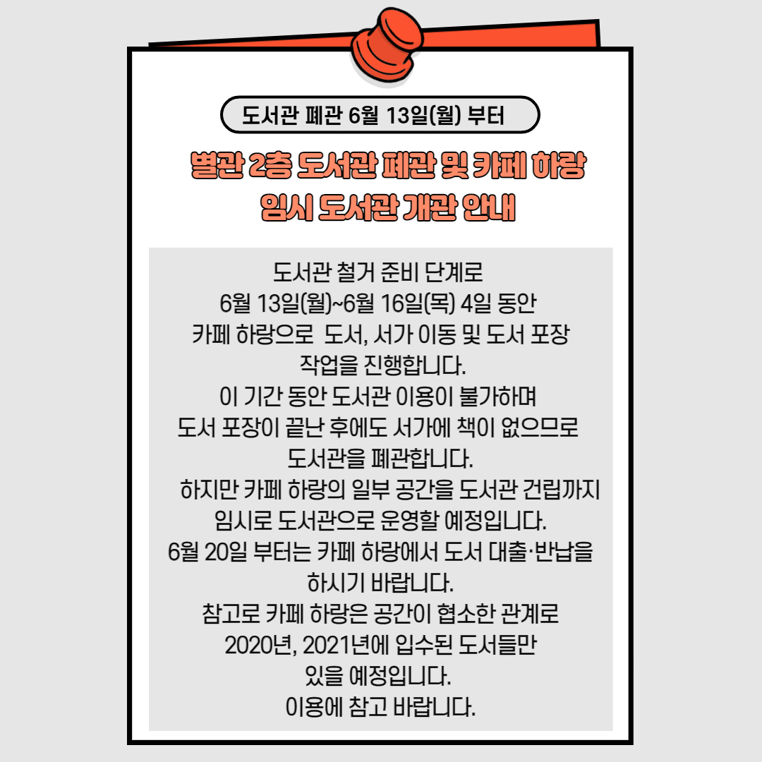 양산고등학교 도서관 폐관 및 카페 하랑 임시 도서관 개관 안내